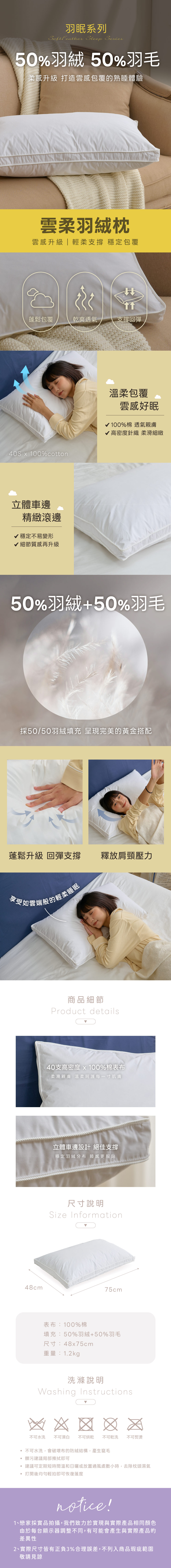 產品名稱:枕頭 / 羽絨枕【雲柔羽絨枕】50%羽絨 羽絨比例升級 雲感包覆 全棉立體表布 羽眠系列