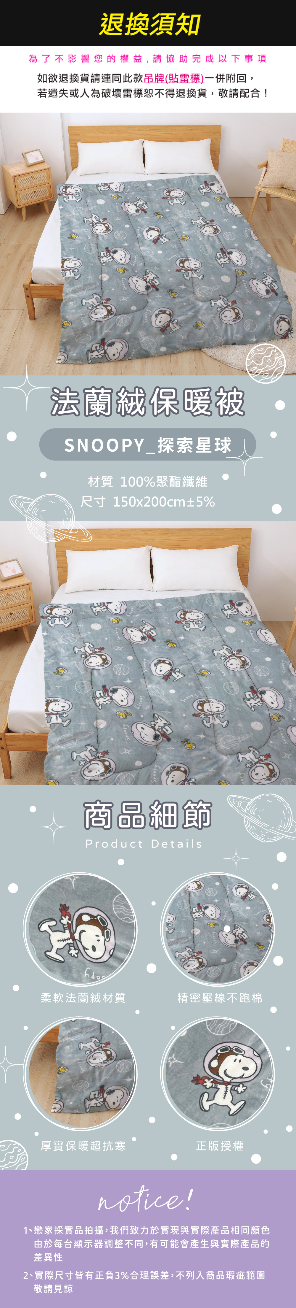 產品名稱:棉被 / 法蘭絨【探索星球】150x200cm SNOOPY 史奴比 正版授權 抗寒冬被 FW01