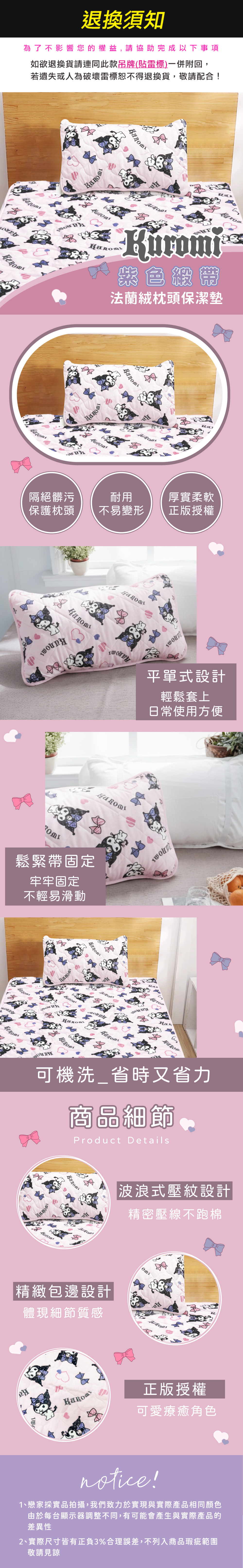 枕頭保暖墊 / 一入【紫色緞帶】法蘭絨 枕頭保潔墊 酷洛米 正版授權 三麗鷗